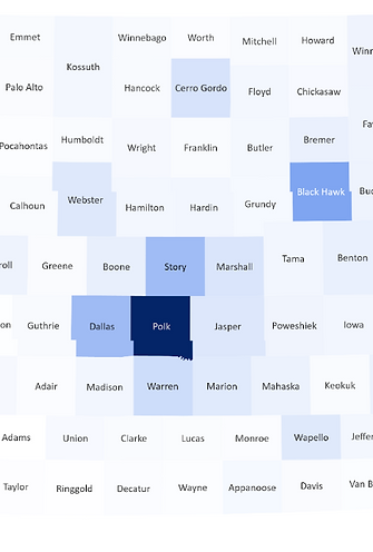 Iowa's number of registered voters is almost proportional to the population size of each county, and counties with large urban areas have the highest percentage of Democrats, like Polk County (40%), which contains the Des Moines Metropolitan Area, and Johnson County (49%), including Iowa City.